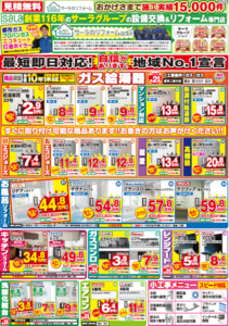 チラシには1日で工事が完了する「トイレ・洗面化粧台・給湯器」を中心に、エアコン取替、システムキッチンやシステムバスも掲載しています。