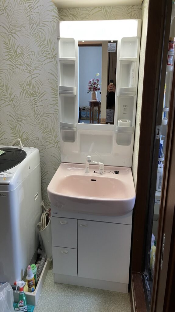 Kさまとお話している際に、洗面台を30年ほど使用しており使い勝手も悪い、古くなって色も変色しており気にしていることを伺う。 金額もピンキリで、ボウルの素材から収納から色々選べること説明。 カタログと何パターンかお見積りをお持ちし、選んでいただいた。 ピンクのボウルが気に入っている。